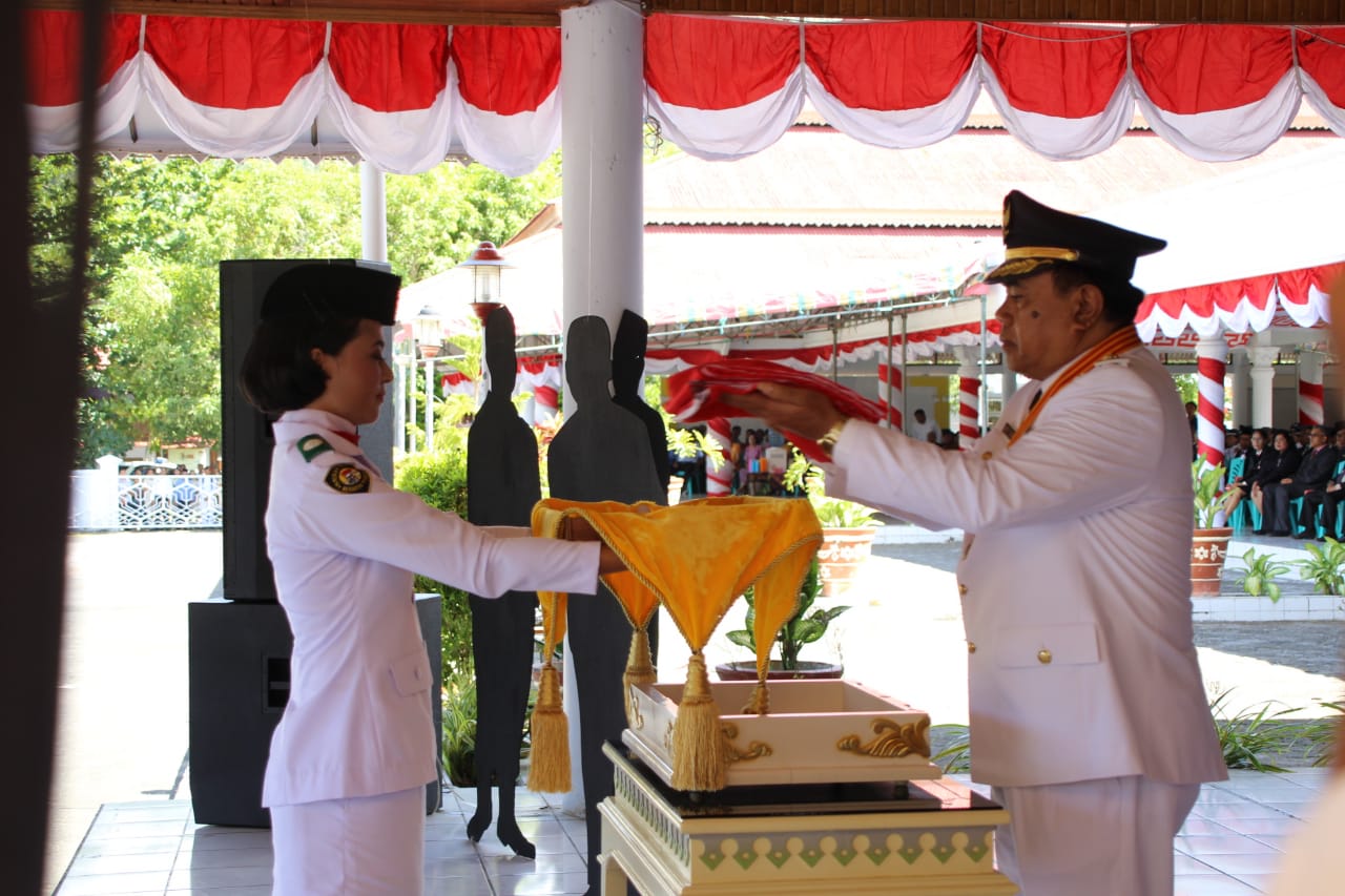 Tahuna, detikawanua.com – Bupati Kabupaten Kepulauan Sangihe Jabes E Gaghana SE ME menyerahkan Bendera Sang Saka Merah Putih kepada anggota Pasukan Pengibar Bendera Pusaka (Paskibraka) saat Upacara Peringatan Detik-detik Proklamasi Kemerdekaan ke-74 di Papanuhung Santiago Tampungan Lawo 17 Agustus 2019. HUT ke-73 RI mengambil tema SDM Unggul Indonesian Maju