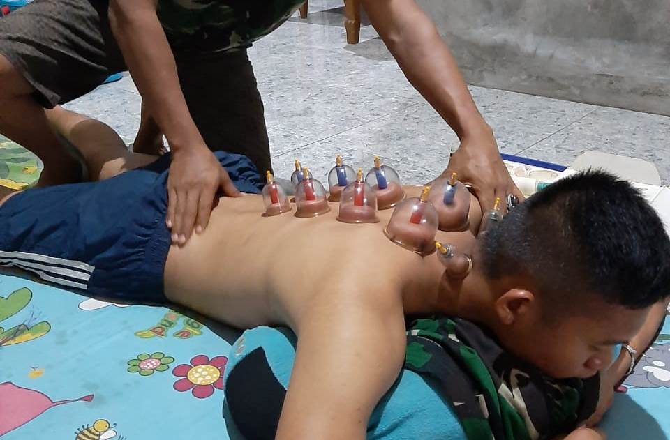 Adalah Serda Rozy, salah seorang anggota satgas TMMD yang sedang “membekam” salah seorang warga. Dengan sedikit ilmu dan keahliannya di bidang pengobatan alternatif, dia mengaplikasikan kepada masyarakat guna meraih simpati warga di gelaran TMMD Kalikondang.