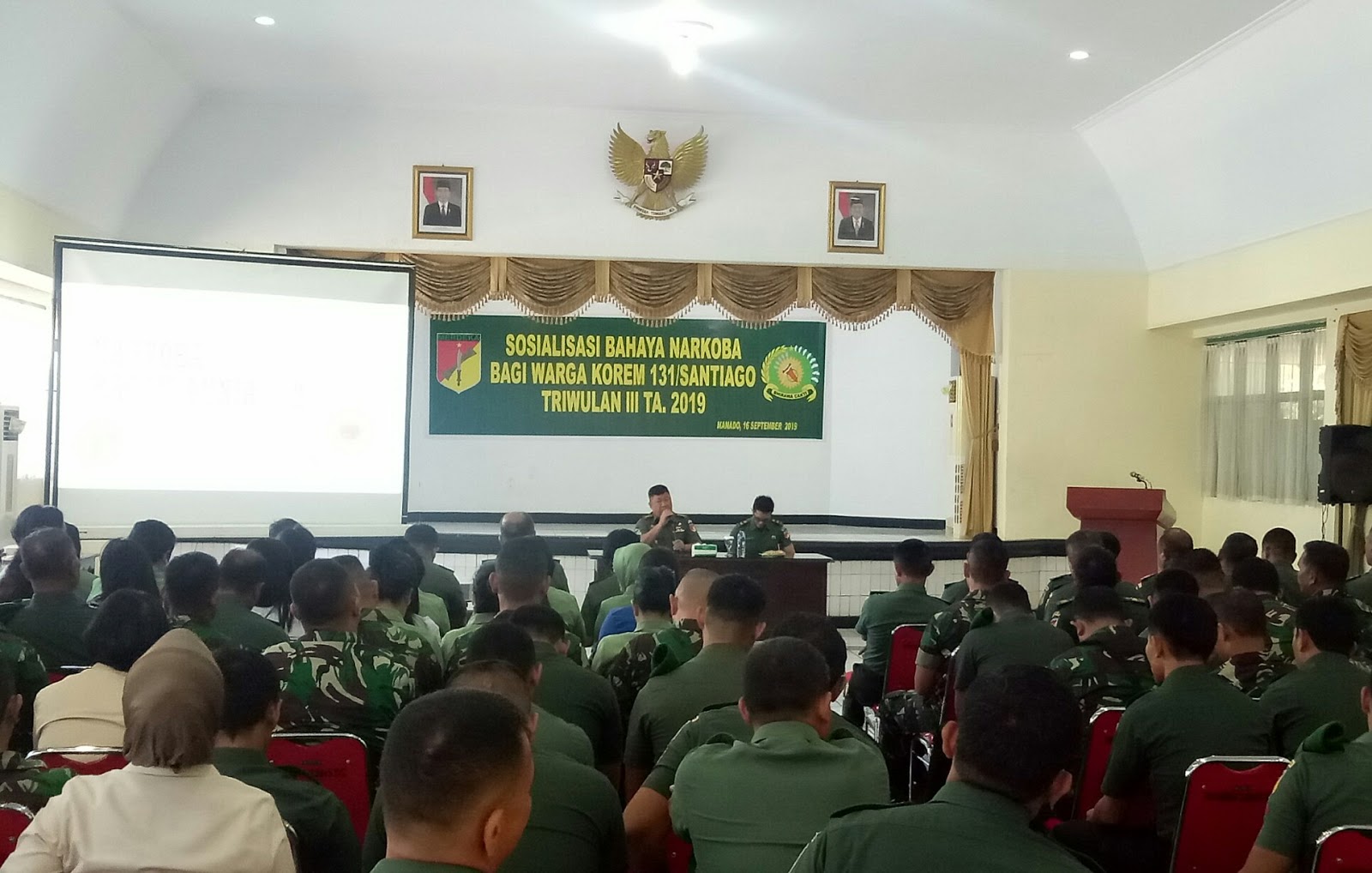Pantauan media, dalam kesempatan itu Kasrem 131 Santiago Kolonel Inf.  Rudolf TS Manoppo membacakan sambutan Komandan Korem yang intinya,semua komunikasi untuk membentengi bahaya narkoba berawal dari lingkup keluarga dan agama. Yang Menjadi komitmen bersama jajaran Korem 131 Santiago diakhir pemaparan adalah “Prajurit Santiago Perangi Narkoba”.