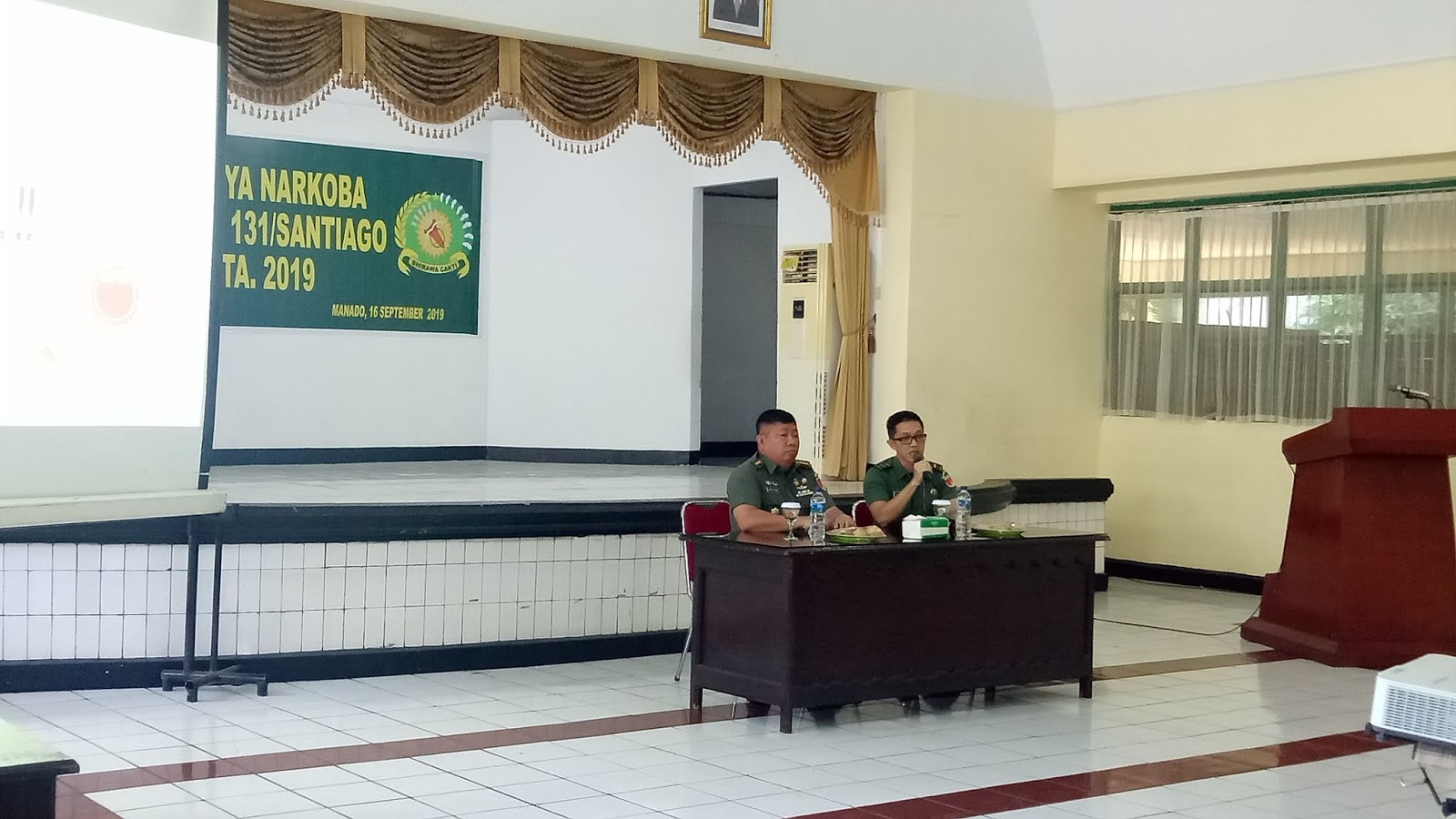 Manado, detiKawanua.com – Mengantisipasi bahaya narkoba bagi manusia, sedari anak-anak hingga dewasa menjadi fokus pencegahan bersama, terlebih dilingkup jajaran TNI. Hal ini yang dilaksanakan jajaran Komando Militer (Korem) 131 Santiago yang dibawahi Brigjen TNI Robert Giri pada Senin (16/09) pagi tadi di Aula Korem 131 Stg dengan menggelar sosialisasi bertajuk “Bahaya Narkoba Bagi Warga Korem 131/Santiago Triwulan III Ta. 2019”, yang diikuti ratusan anggota  jajaran prajurit beserta perwira menengah, Ibu-Ibu Persit Korem, insan akademisi/mahasiswa UNIMA dan Pers. Adapun sosialisasi tentang ‘Narkoba Racun Dunia’ yang disampaikan Letda Ckm dr Albertus Maria Henry Santoso, secara terang bederang bahaya dan dampak dari narkoba bagi semua kalangan, termasuk dalam tubuh TNI (seperti dalam penayangan video, terjadi pemecatan anggota dengan tidak hormat).