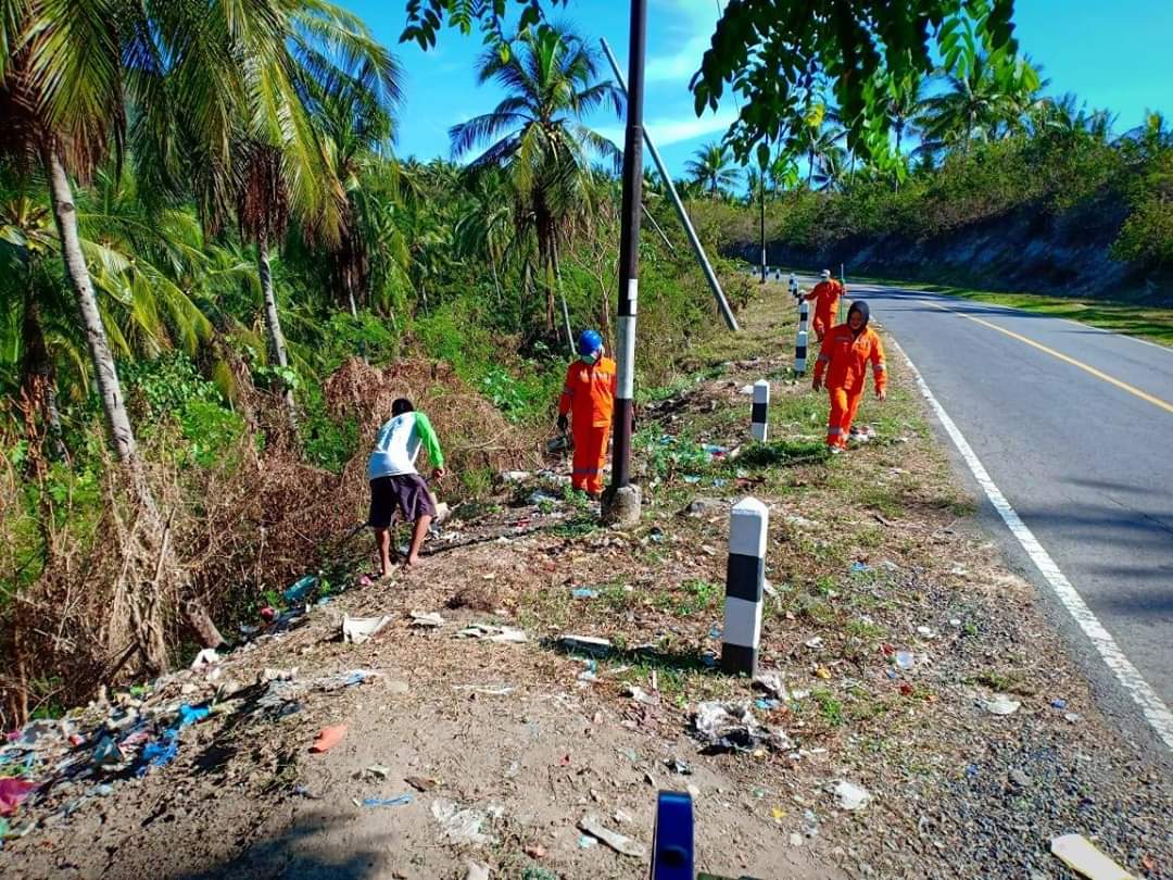 DLH Boltim tengah membersihkan sampah di jalan raya antara Desa Buyat-Kotabunan.