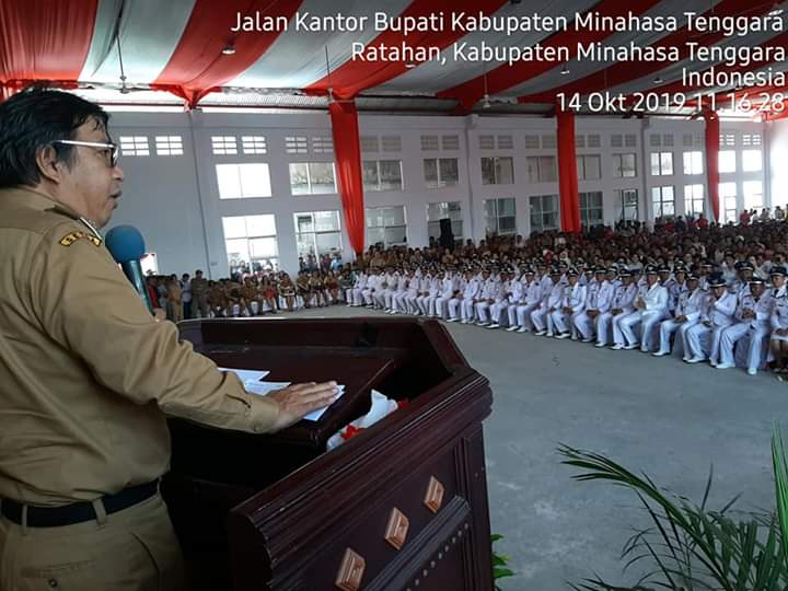 Mitra,detiKawanua.com – Bupati Minahasa Tenggara (Mitra) James Sumendap SH,mewarning puluhan Hukum Tua yang baru di lantik di Sport Hall Pemkab Mitra.