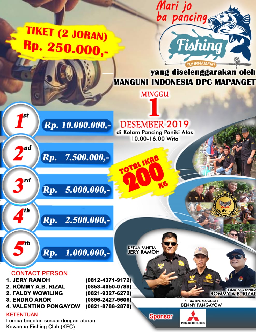 Lomba pancing dengan tagline ‘Mari jo ba Pancing’ ini, rencananya digelar di Kolam Pancing Paniki Atas, Kecamatan Talawaan, Kabupaten Minahasa Utara (Minut), Minggu (1/12),