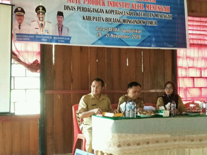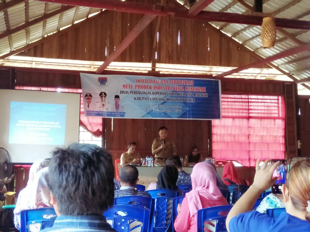 Boltim, detiKawanua.com – Sosialisasi dan Sertifikasi Mutu Produk Industri Kecil Menengah digelar Dinas Perdagangan Kopersi Usaha Kecil dan Menengah (Disperdangkop) Kabupaten Bolaang Mongngondow Timur (Boltim), tepat di Aula Safira, Desa Tombolikat, Kecamatan Tutuyan, Selasa (19/11) siang tadi.