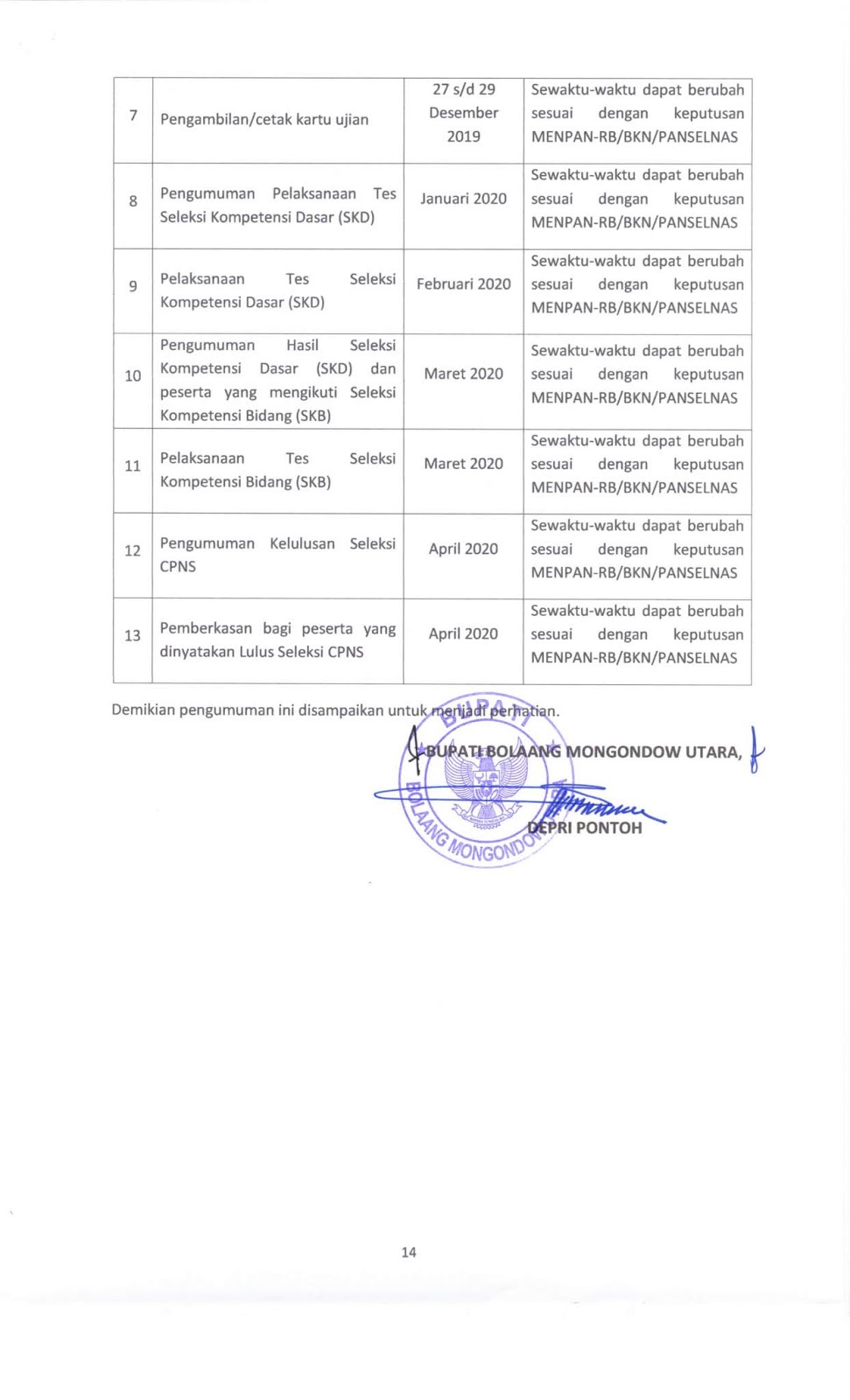 BOLMUT, detiKawanua.com – Resmi Di umumkan oleh Pemerintah Daerah (PEMDA) Kabupaten Bolaang Mongondow Utara (BOLMUT), jumlah kouta formasi Calon Pegawai Negeri Sipil bernomor 800/1909/SETDAKAB/BKPP denga alokasi formasi atau penempatan akan disebar di 16 instansi dilingkup Pemda Bolmut dengan kuota penerimaan 190 orang.