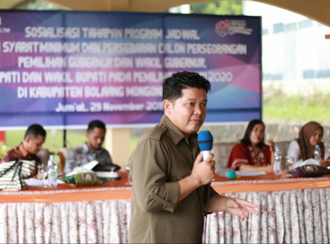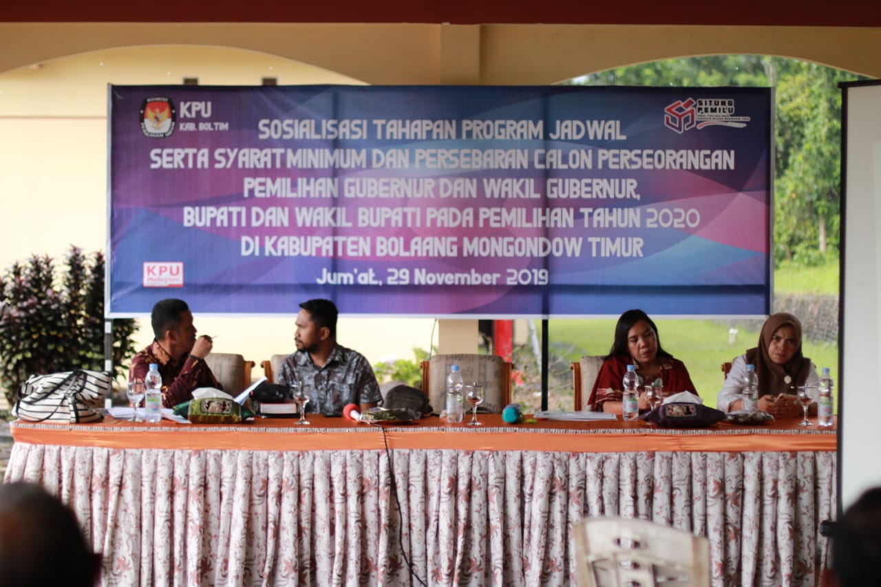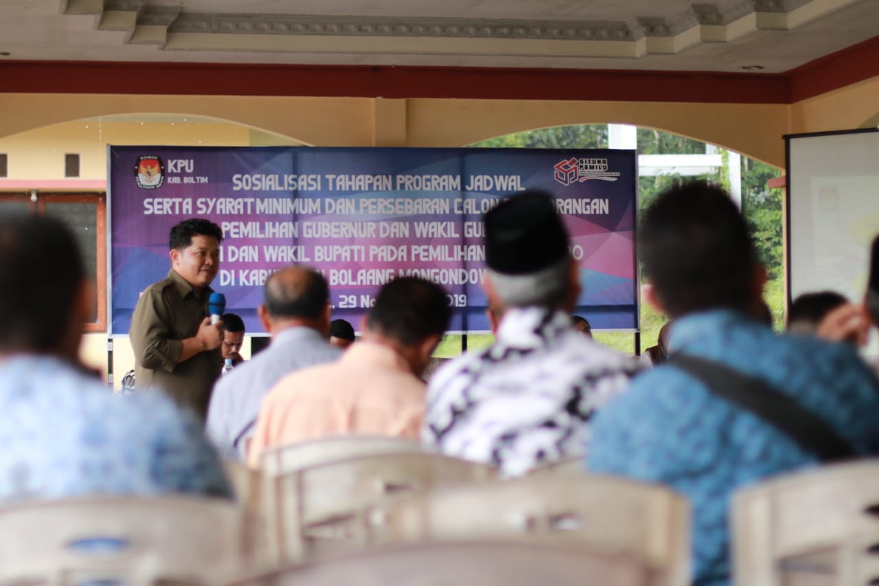 Boltim, detiKawanua.com – Komisi Pemilihan Umum Daerah (KPUD) menggelar sosialisasi tahapan program jadwal serta syarat minimum dan persebaran calon perseorangan pemilihan Gubernur dan Wakil Gubernur, Bupati dan Wakil Bupati pada pemilihan tahun 2020 di kabupaten Bolaang Mongondow Timur (Boltim), Jumat (29/11).