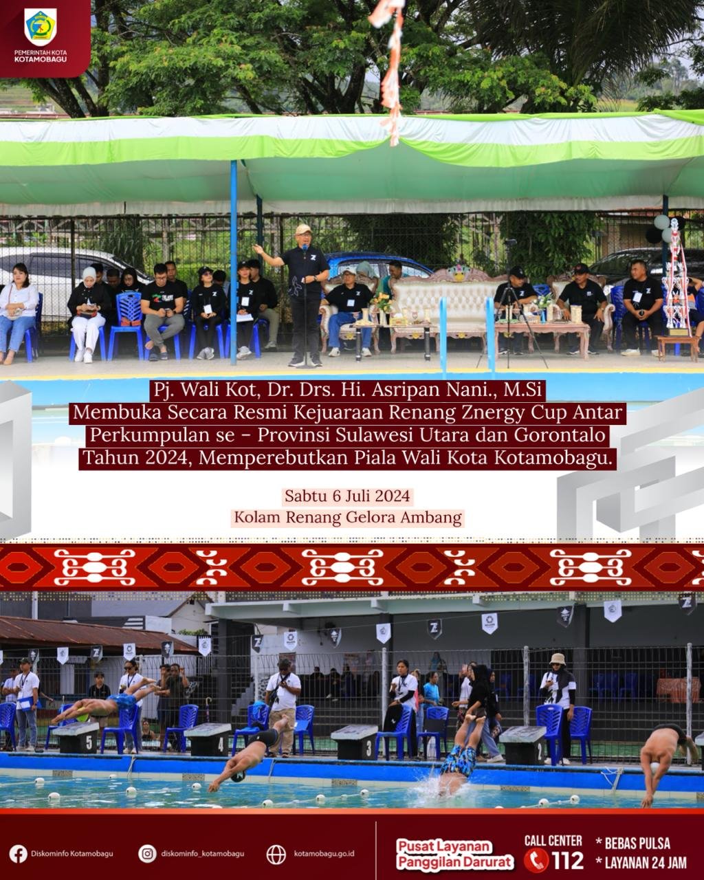 Kotamobagu- Pj. Wali Kot Asripan Nani membuka secara resmi kejuaraan Renang Znergy Cup antar perkumpulan se Provinsi Sulawesi Utara dan Gorontalo (SulutGo) Tahun 2024.