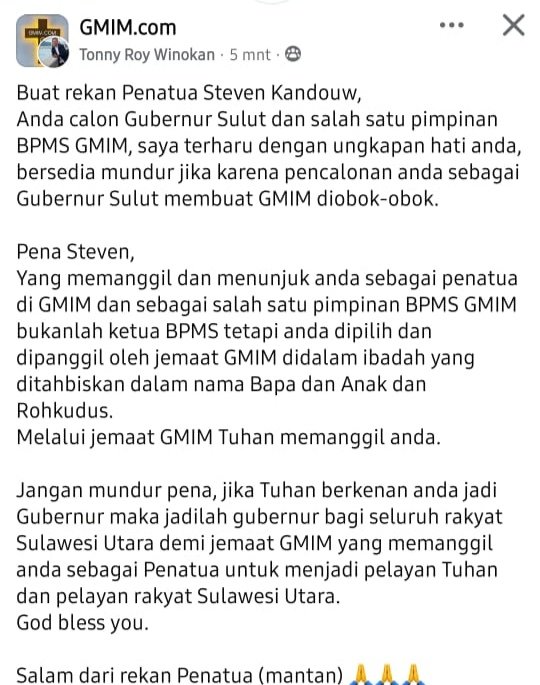 Buat rekan Penatua Steven Kandouw, Anda calon Gubernur Sulut dan salah satu pimpinan BPMS GMIM, saya terharu dengan ungkapan hati anda, bersedia mundur jika karena pencalonan anda sebagai Gubernur Sulut membuat GMIM diobok-obok.