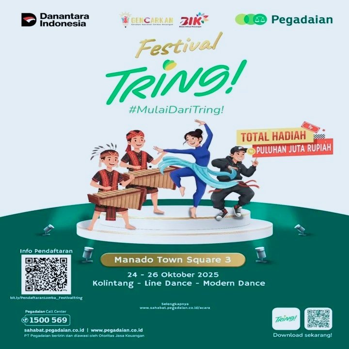 Festival Tring! ini akan di gelar selama tiga hari, yakni pada hari Jumat sampai hari Sabtu, (24-26/10/2025) dan akan dilaksanakan di Manado Town Square (Mantos) tiga. Ajang ini bakal menjadi sebuah perayaan besar yang memadukan hiburan, budaya, dan literasi keuangan digital dalam satu panggung.