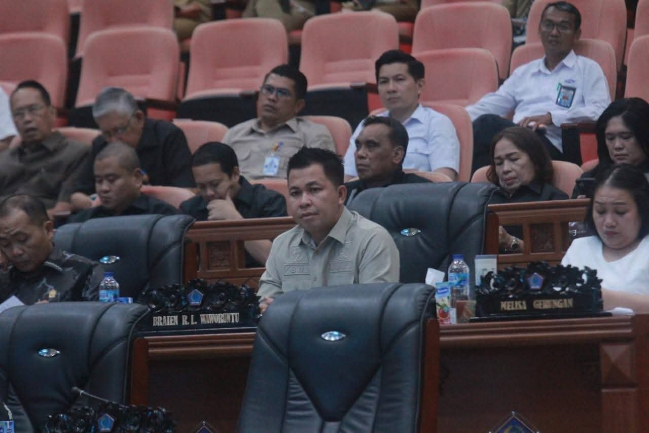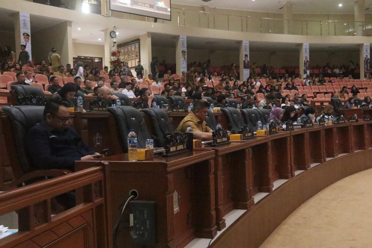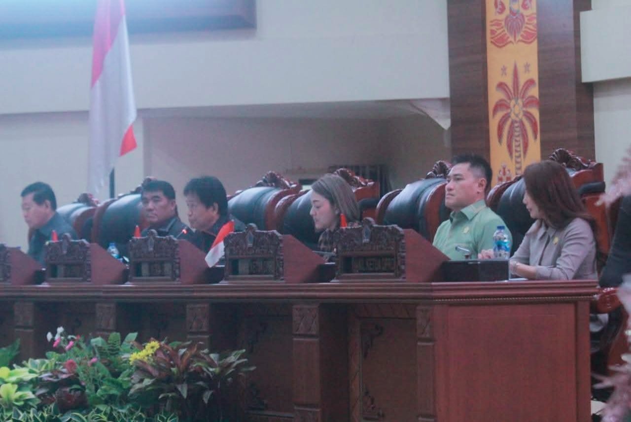 Rapat paripurna dipimpin Ketua DPRD Sulut, Fransiskus Andi Silangen didampingi Wakil Ketua Michaela Paruntu, Royke Anter, Stela Marlina Runtuwene, dan dihadiri Gubernur Sulut Yulius Selvanus dan Wagub Victor Mailangkay.