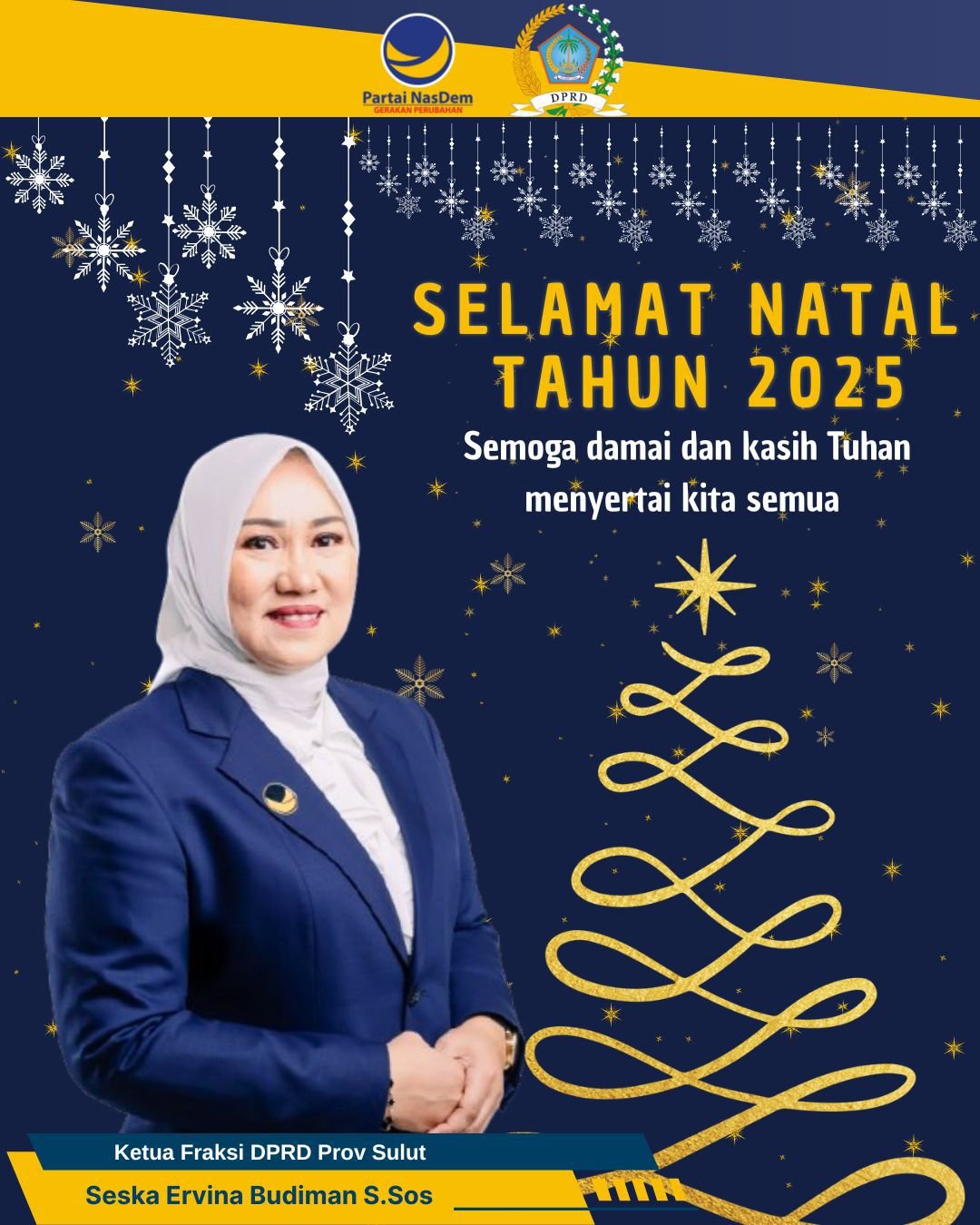SULUT – Dalam menyambut Natal 25 Desember 2025 dan Tahun Baru 1 Januari 2026, Ketua Fraksi NasDem DPRD Provinsi Sulawesi Utara (Sulut), Seska Ervina Budiman menyampaikan selamat kepada seluruh umat yang merayakan di Provinsi Sulut, khususnya di dapilnya Bolmong Raya (BMR).