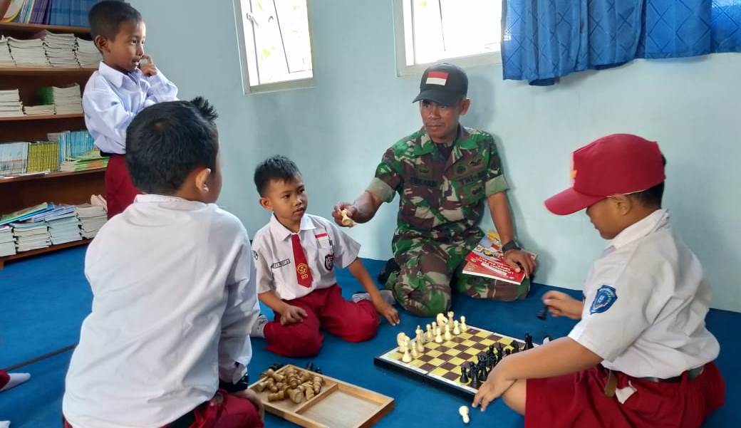 Seperti yang dilakukan Serka Ngdiyono, di sela-sela waktunya bekerja di sasaran fisik TMMD, dia menyempatkan untuk mampir ke SDN 1 Kalikondang dan mengajar main catur kepada murid-murid setempat.