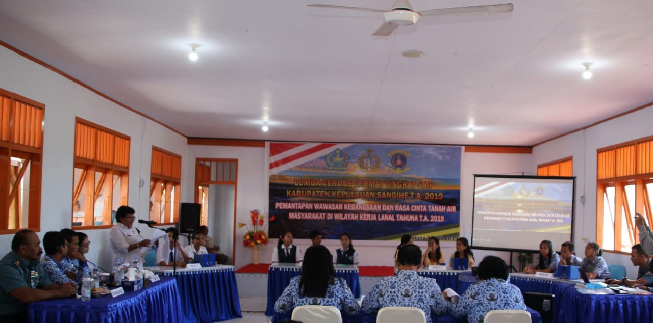 Tahuna, detikawanua.com – Empat Sekolah Menengah Pertama (SMP) masuk final lomba cerdas cermat (LCC) Wawasan Kebangsaan tingkat SMP se Kabupaten Kepulauan Sangihe. Giat tersebut diselenggarakan oleh TNI AL Tahuna. Lomba Cerdas Cermat Tingkat Pertama dengan Tema “Pemantapan Wawasan Kebangsaan Cinta Tanah Air dan Bela Negara Masyarakat Di wilayah Kerja TNI AL Tahuna, dibabak pengisihan LCC dihadiri oleh :